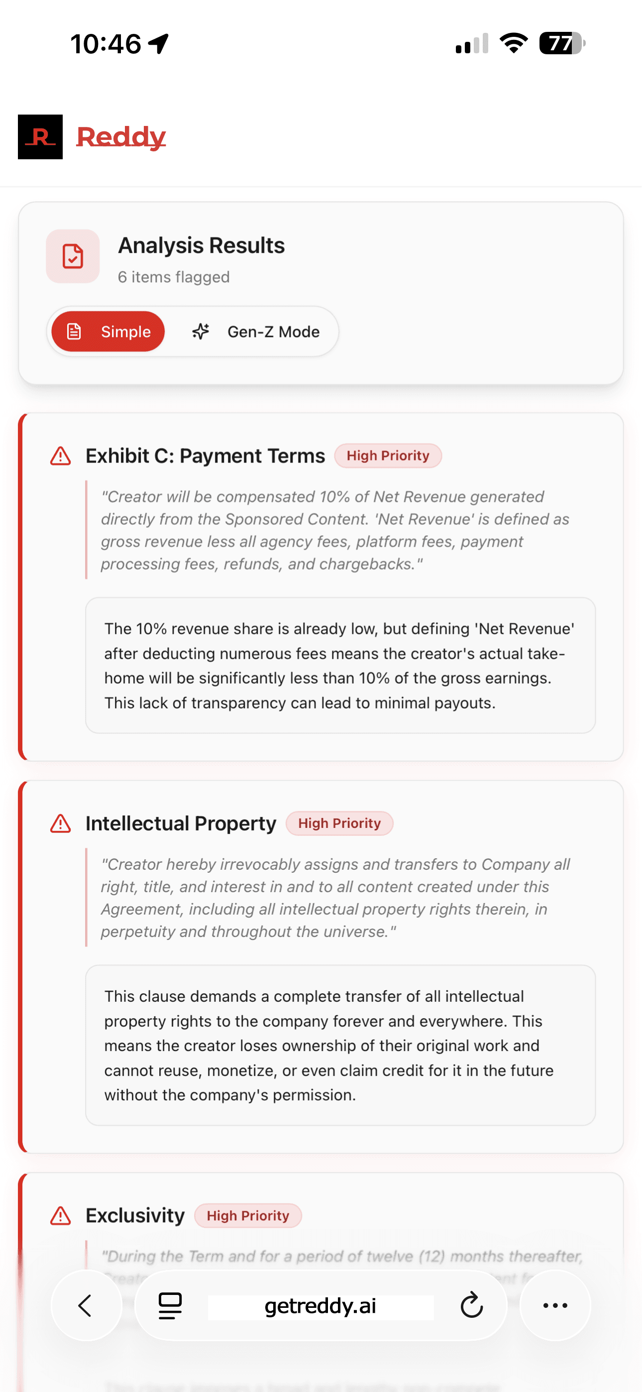 Reddy instantly reviews your contracts, terms, and agreements—flagging the red-line sections that could work against you.